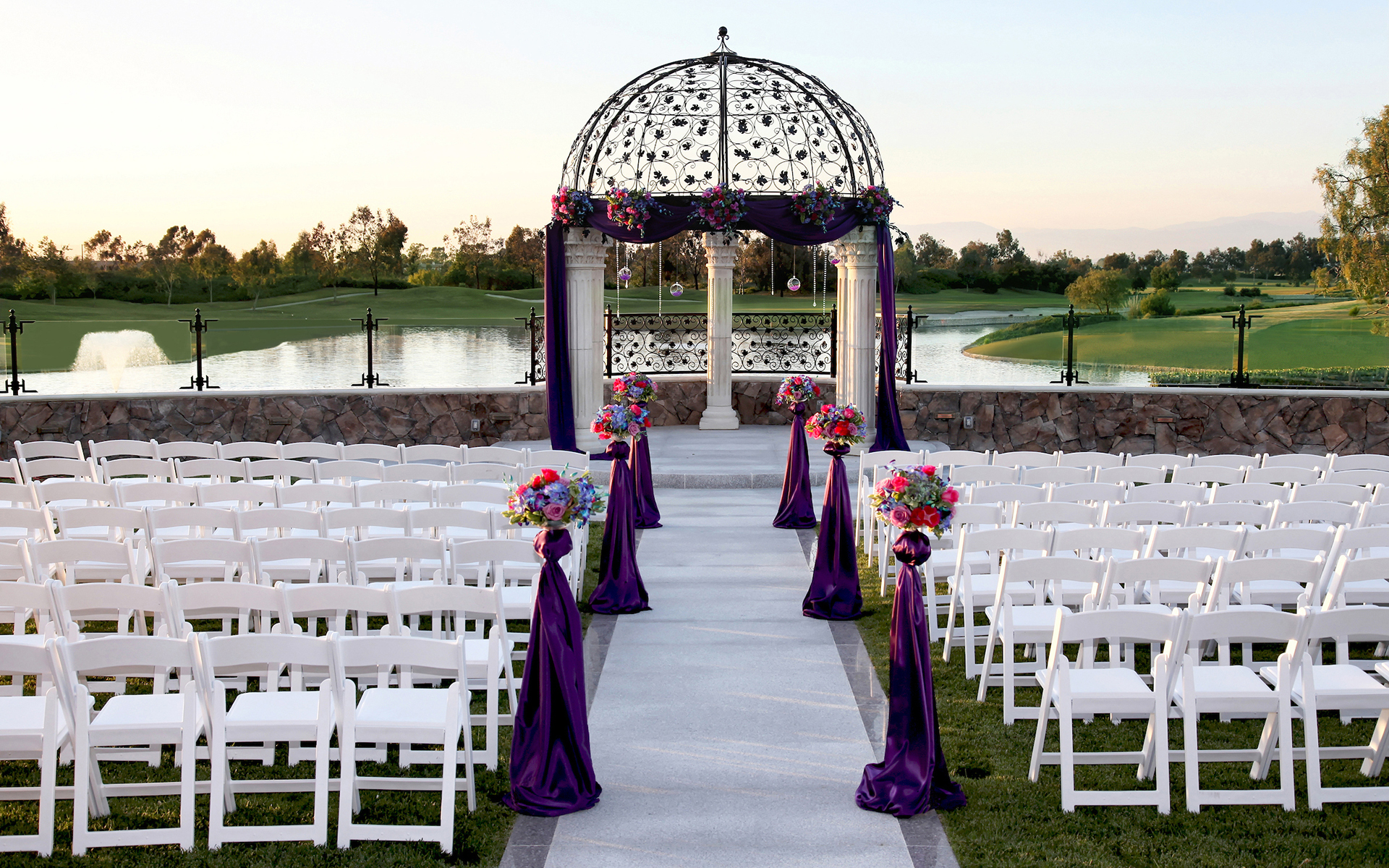 In our signature outdoor wedding venue, the world beyond “I do” seems to fade away. A handcrafted wrought iron pergola crown draws all eyes toward the wedding couple, while panoramic views of lush greens, sparkling fountains, distant mountains and the open sky immerse friends and family in the celebration.